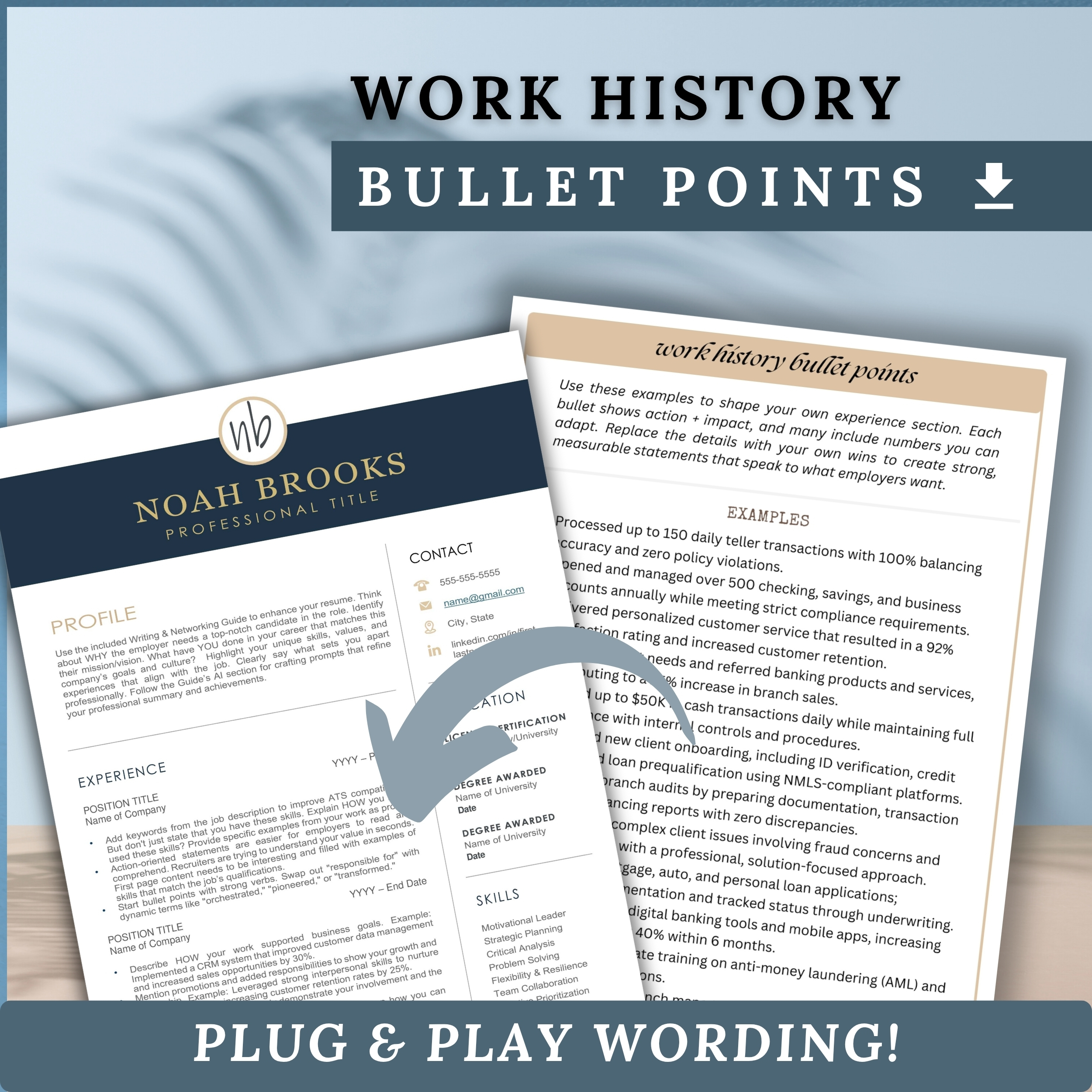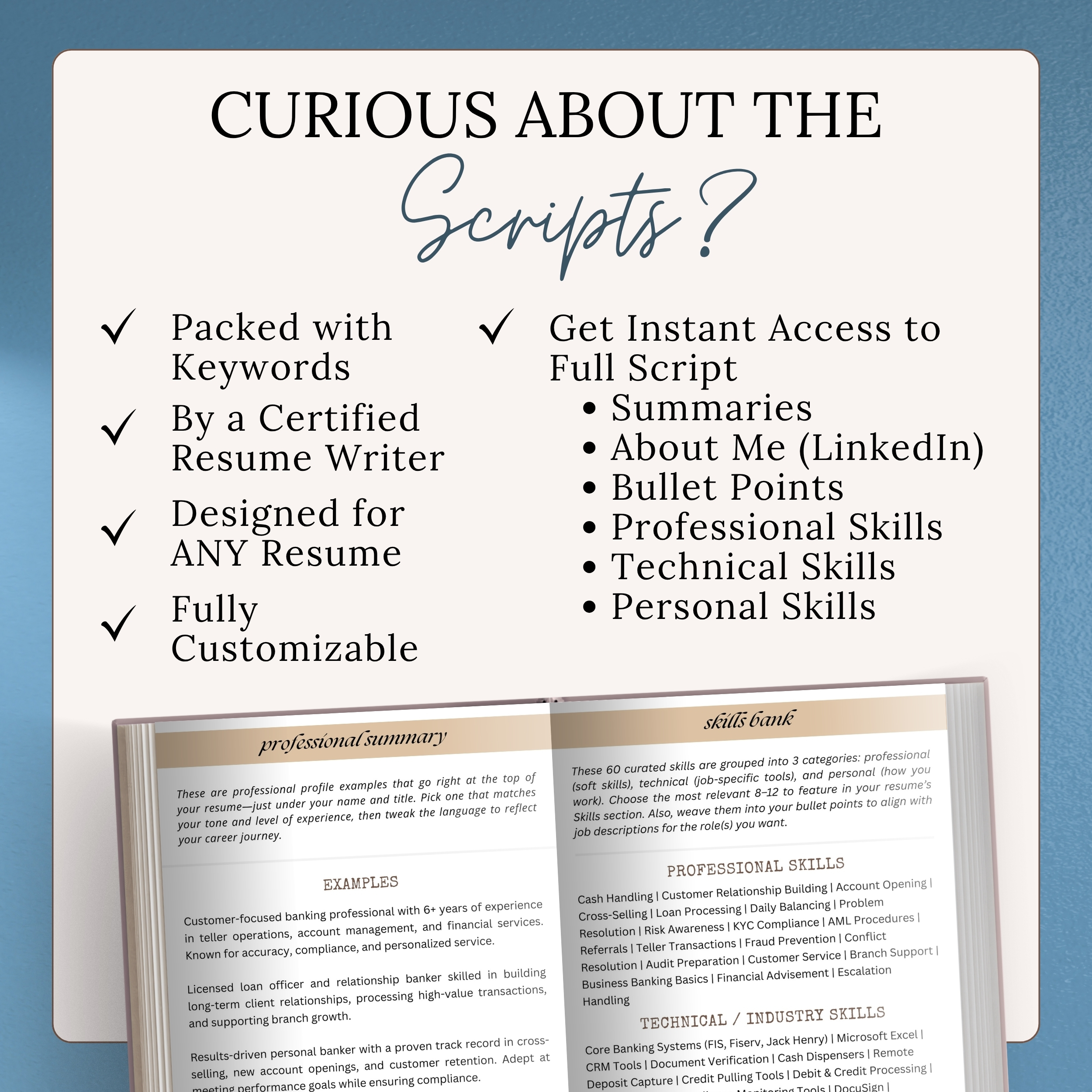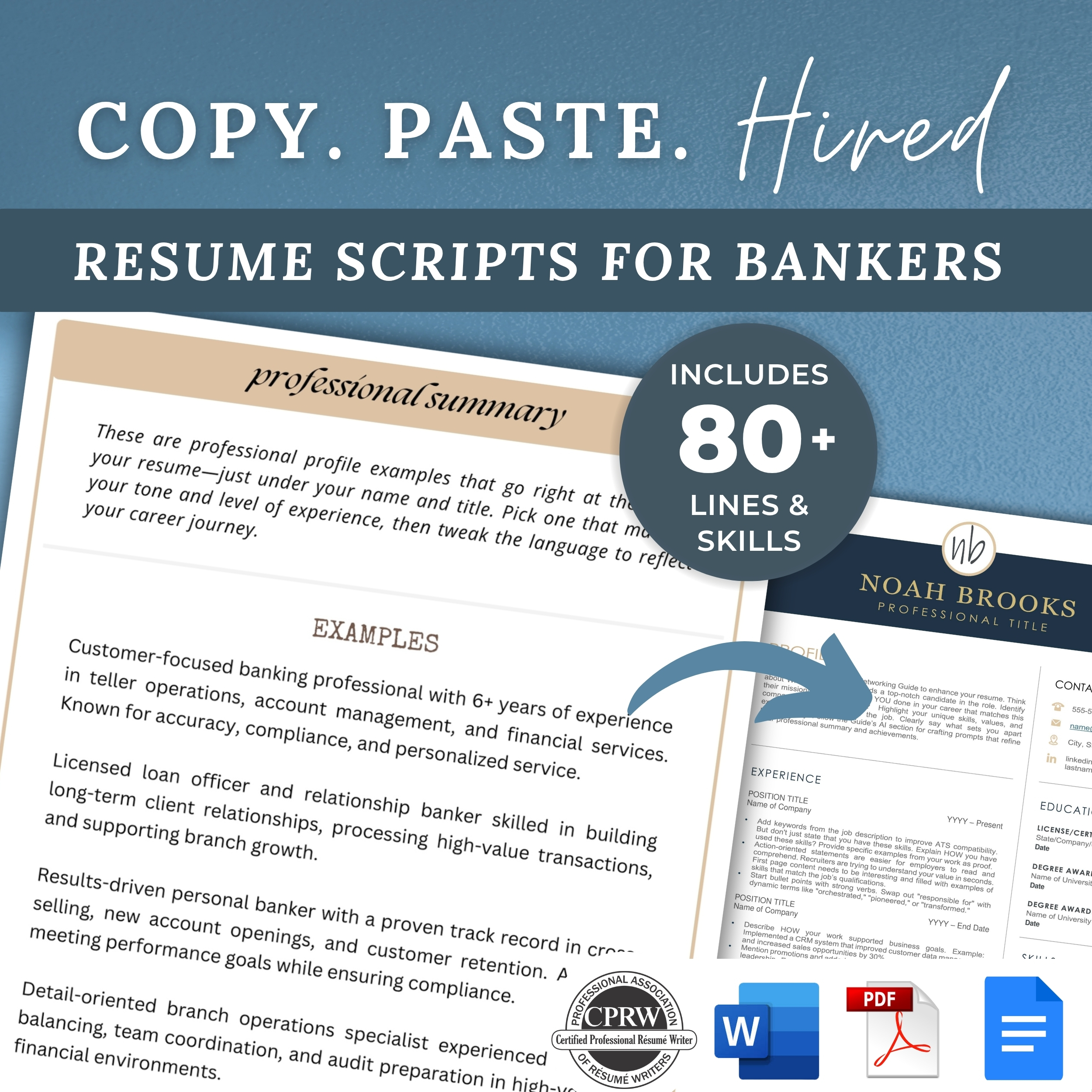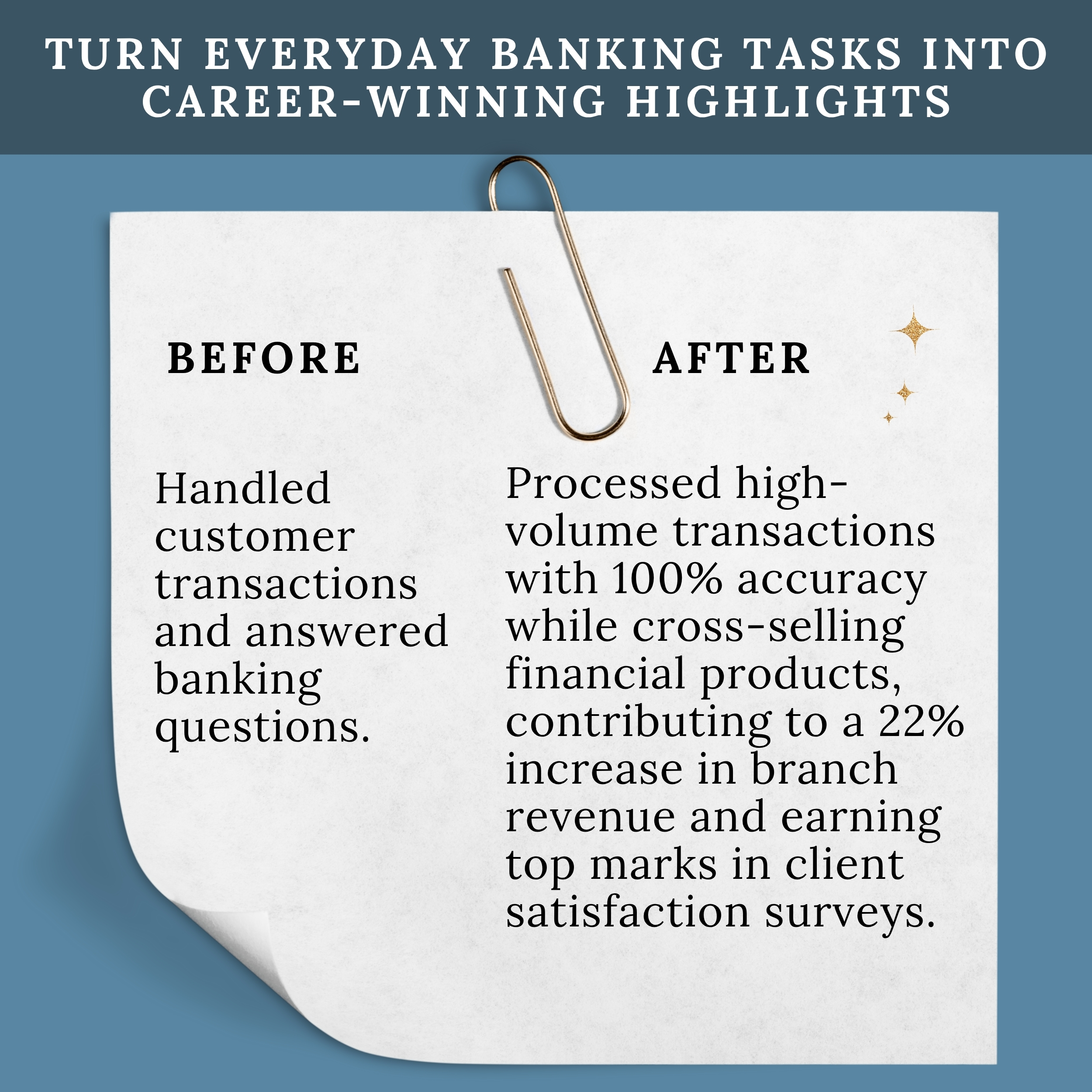 This banker writing template includes copy-paste resume script content for finance job seekers working in banks, credit unions, or customer-facing financial roles. Designed to help you describe your experience in professional banking terms, this script features resume words, job description language, and loan officer CV skills tailored for teller and finance positions. These scripts help you polish your banking resume in minutes with prewritten lines that show off your customer service, cash handling, and finance skills.