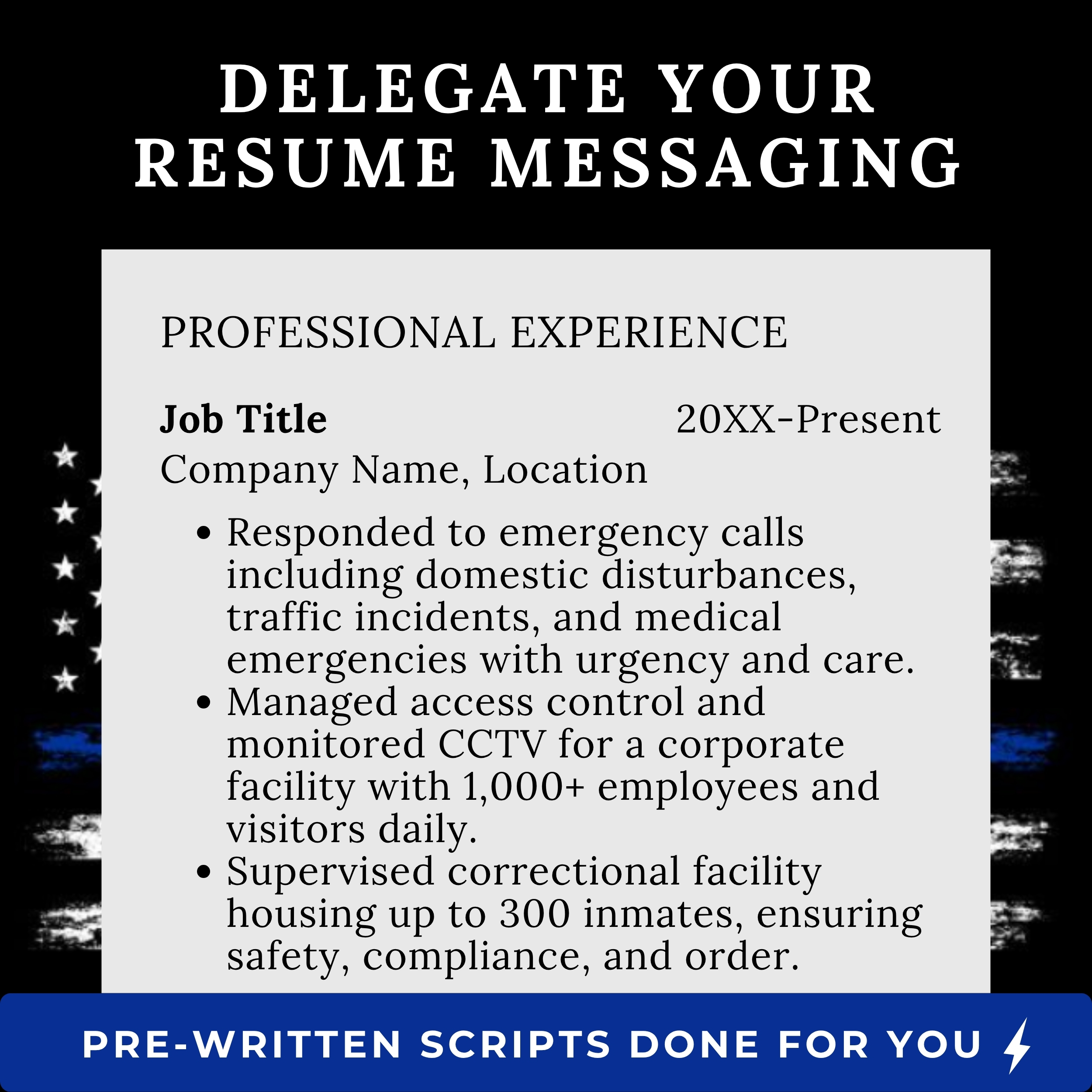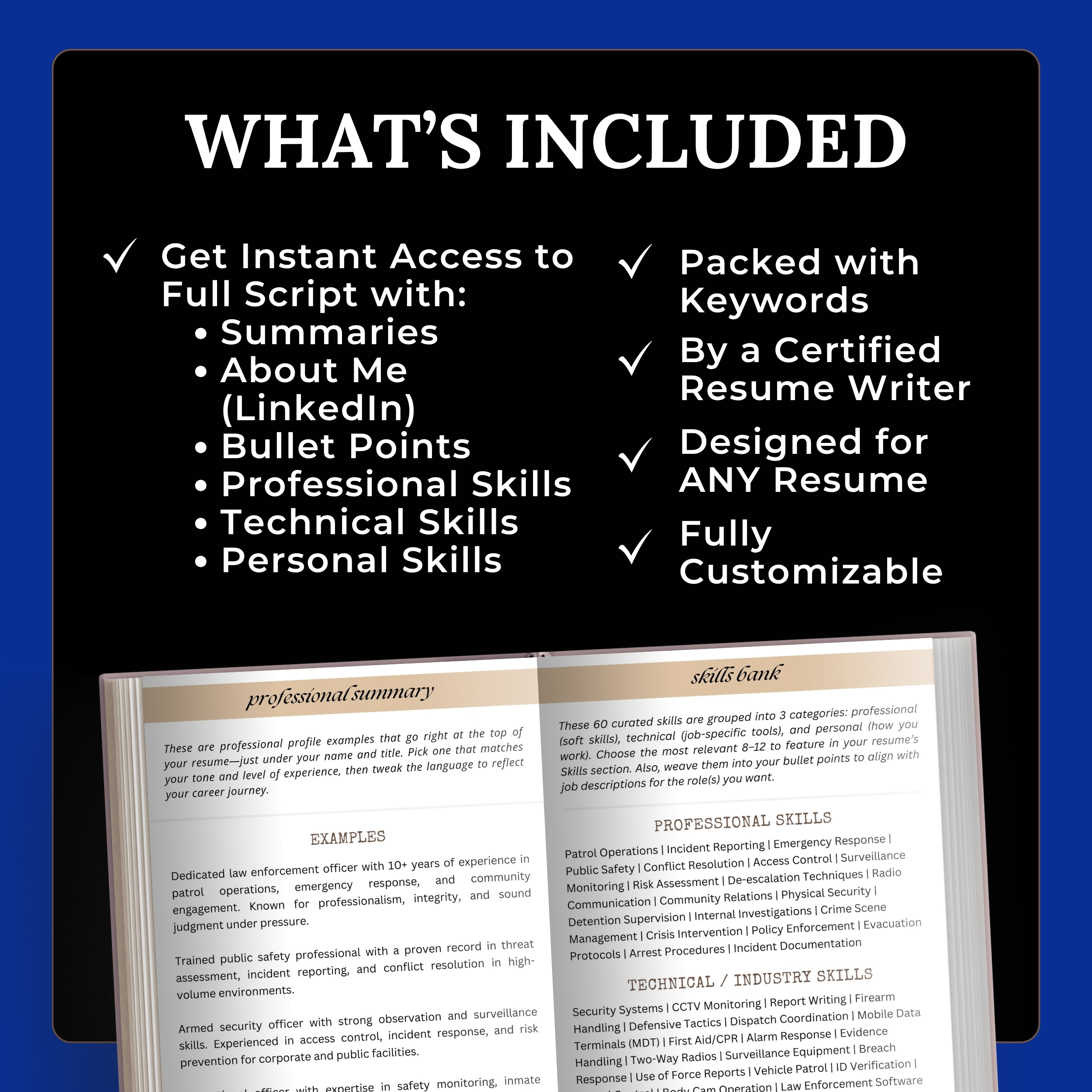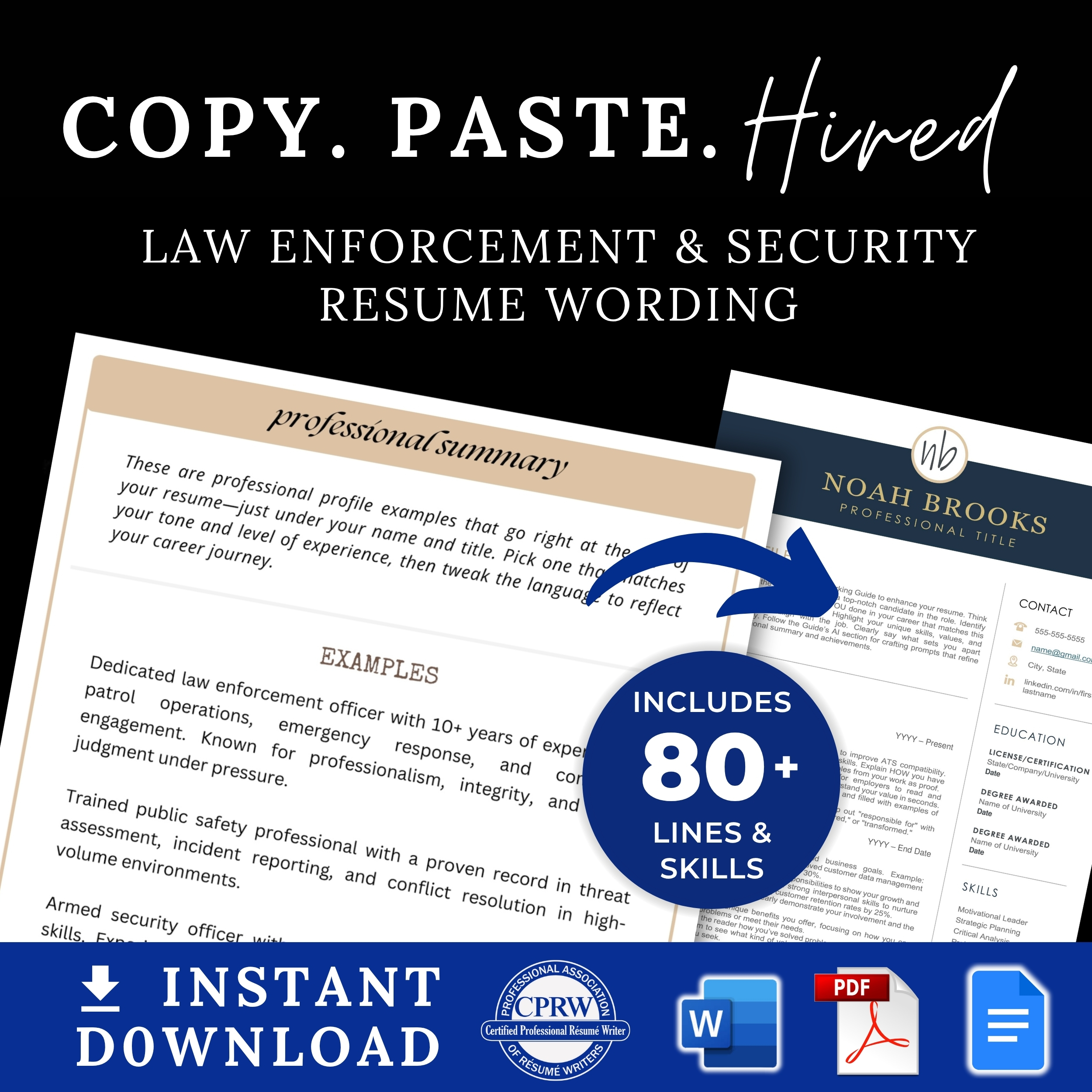 This security resume wording template includes prewritten content for law enforcement, corrections, public safety, and private security professionals. With officer resume language, job description phrases, and CV sample lines, this script helps you present your skills and experience with the clarity and authority needed to succeed in high-trust roles. These scripts help you write with confidence using proven resume language tailored to safety, leadership, and emergency response roles.Created by a Certified Professional Resume Writer and former HR recruiter. This tool removes the guesswork and helps you sound clear, confident, and qualifiedwithout hiring a writing service.