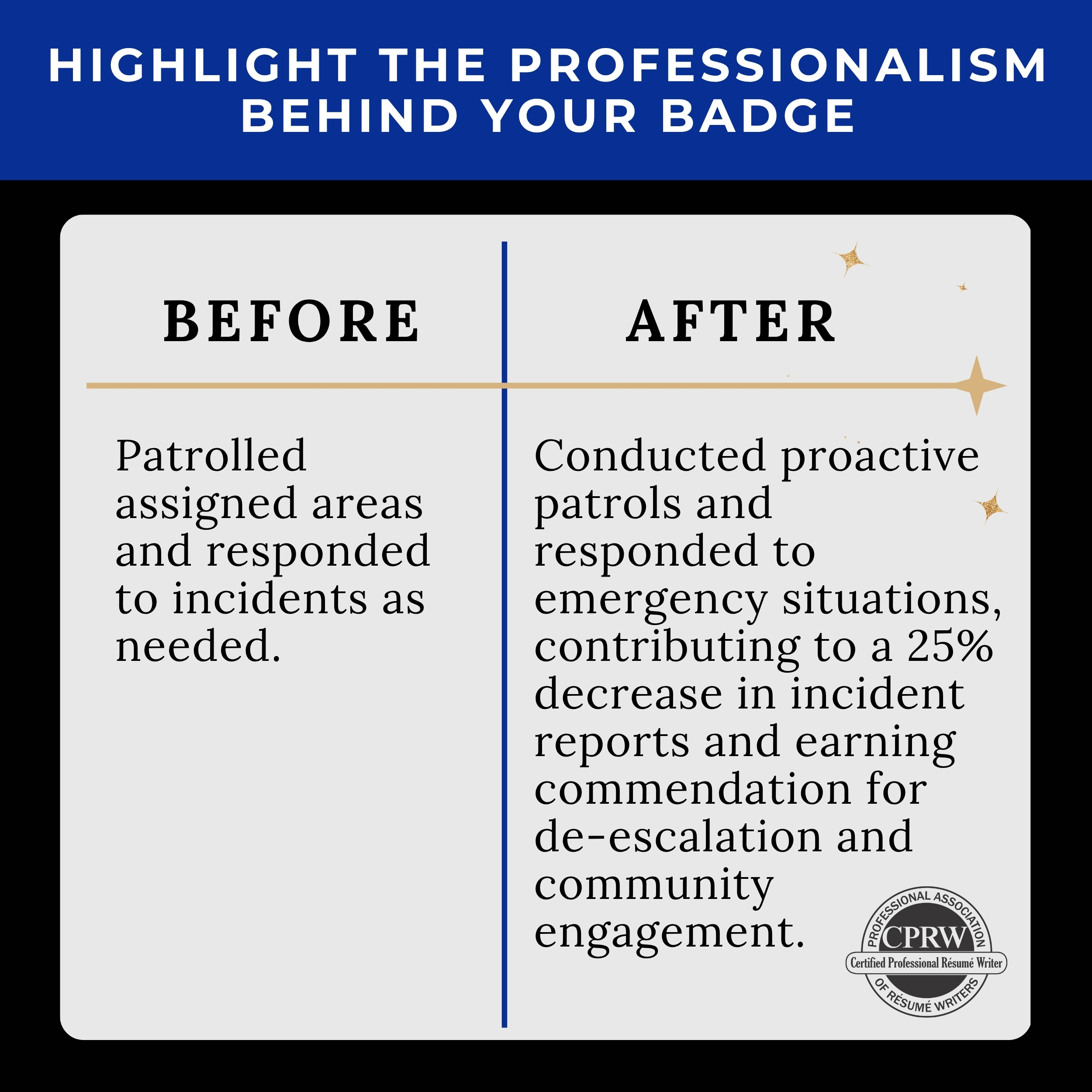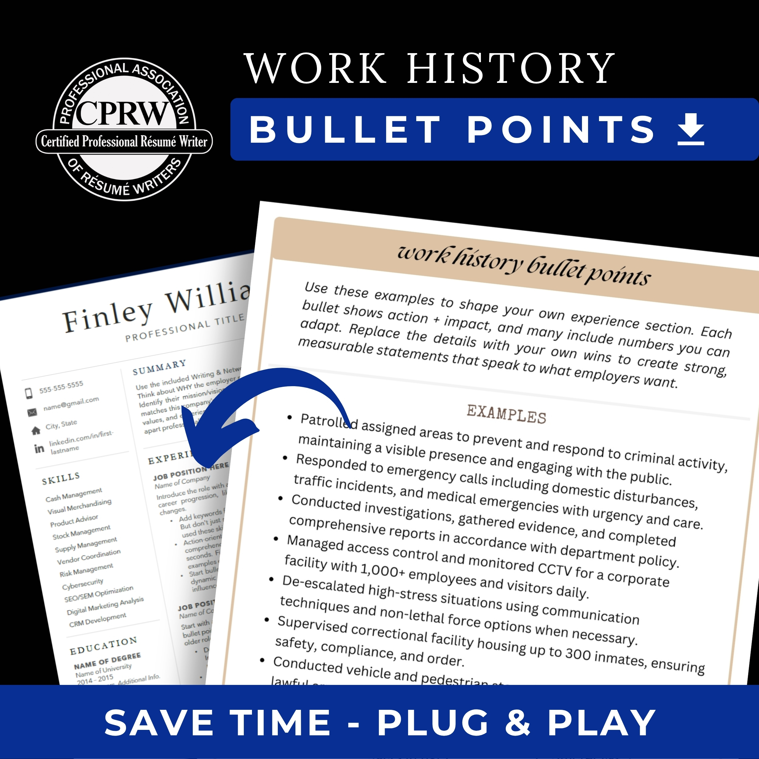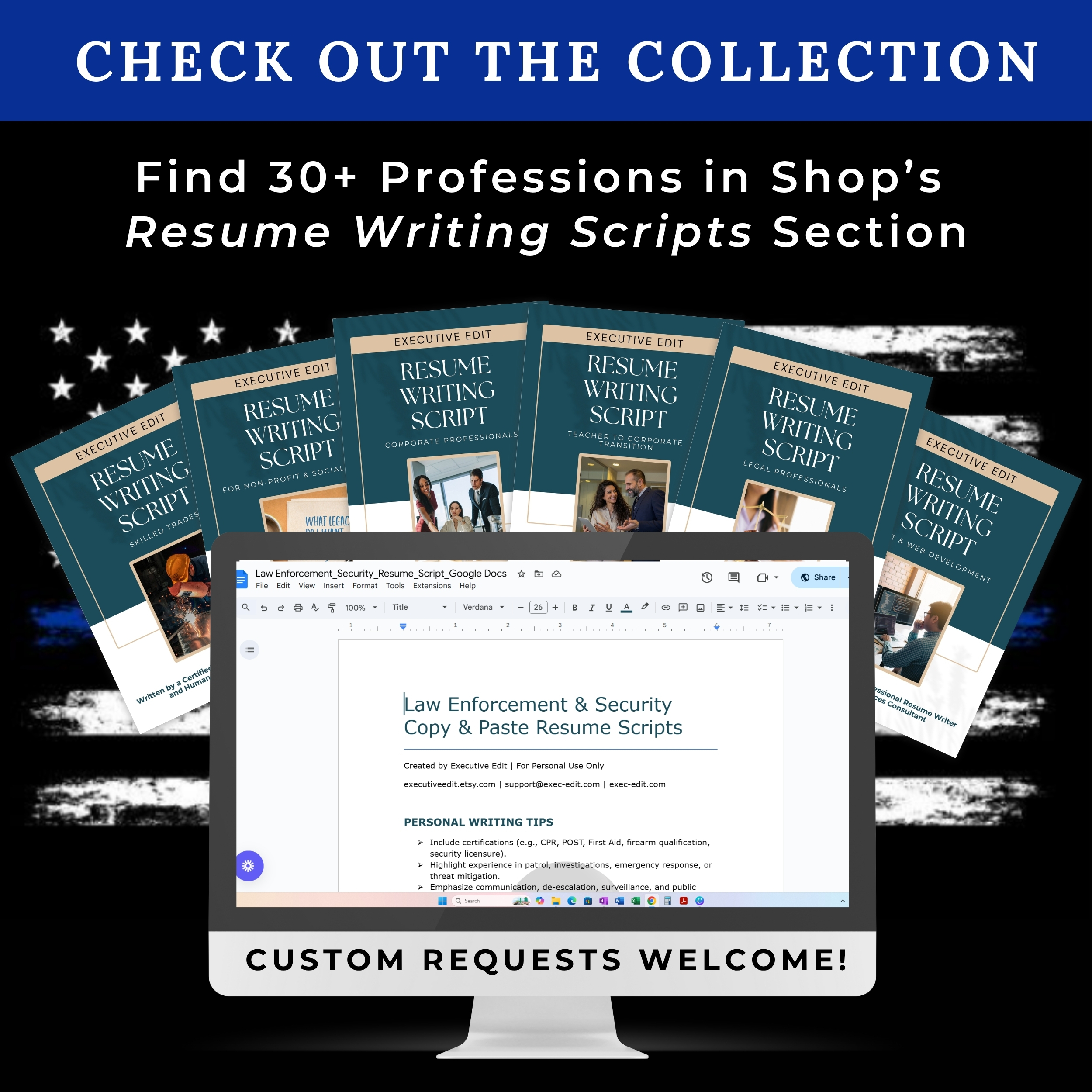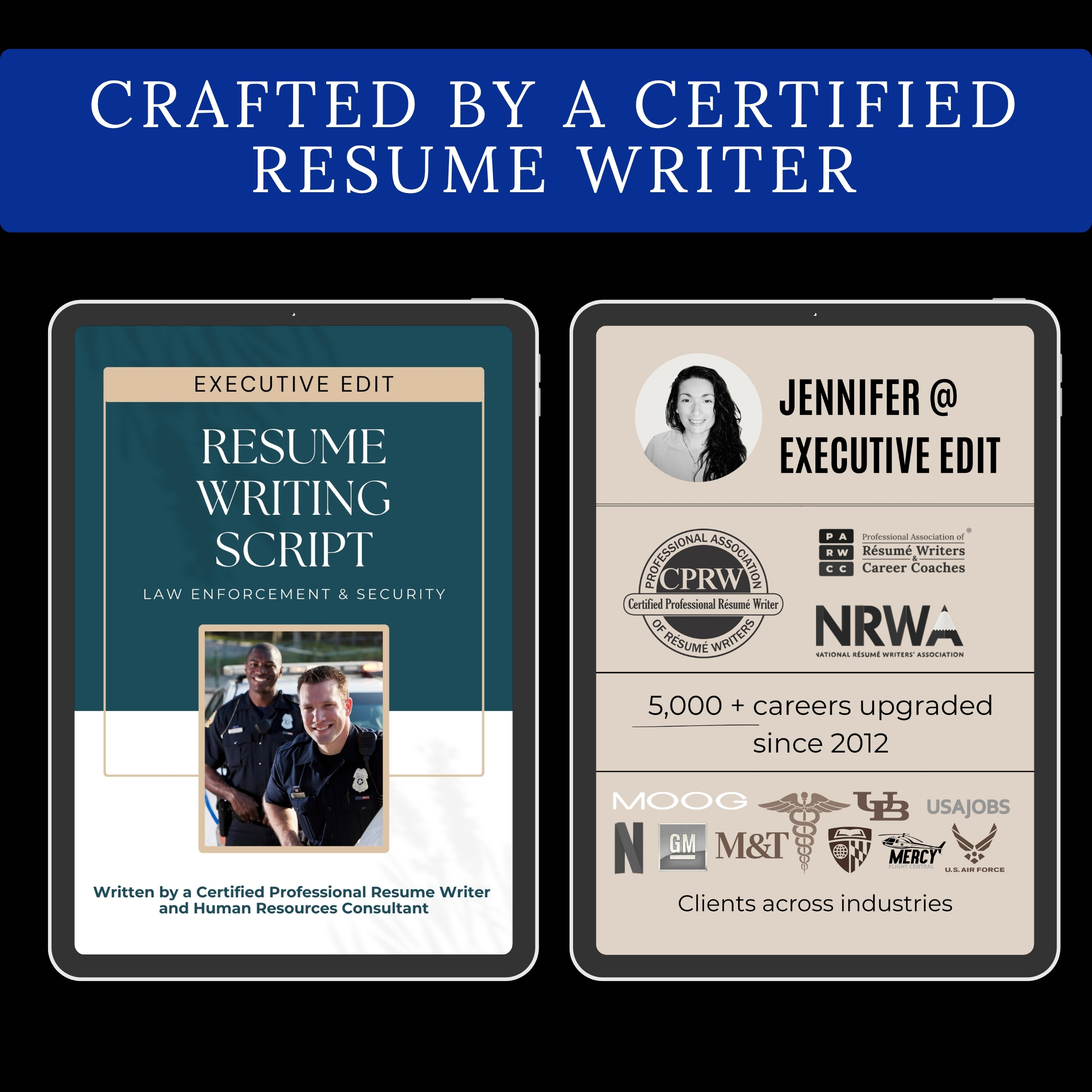 This security resume wording template includes prewritten content for law enforcement, corrections, public safety, and private security professionals. With officer resume language, job description phrases, and CV sample lines, this script helps you present your skills and experience with the clarity and authority needed to succeed in high-trust roles. These scripts help you write with confidence using proven resume language tailored to safety, leadership, and emergency response roles.Created by a Certified Professional Resume Writer and former HR recruiter. This tool removes the guesswork and helps you sound clear, confident, and qualifiedwithout hiring a writing service.